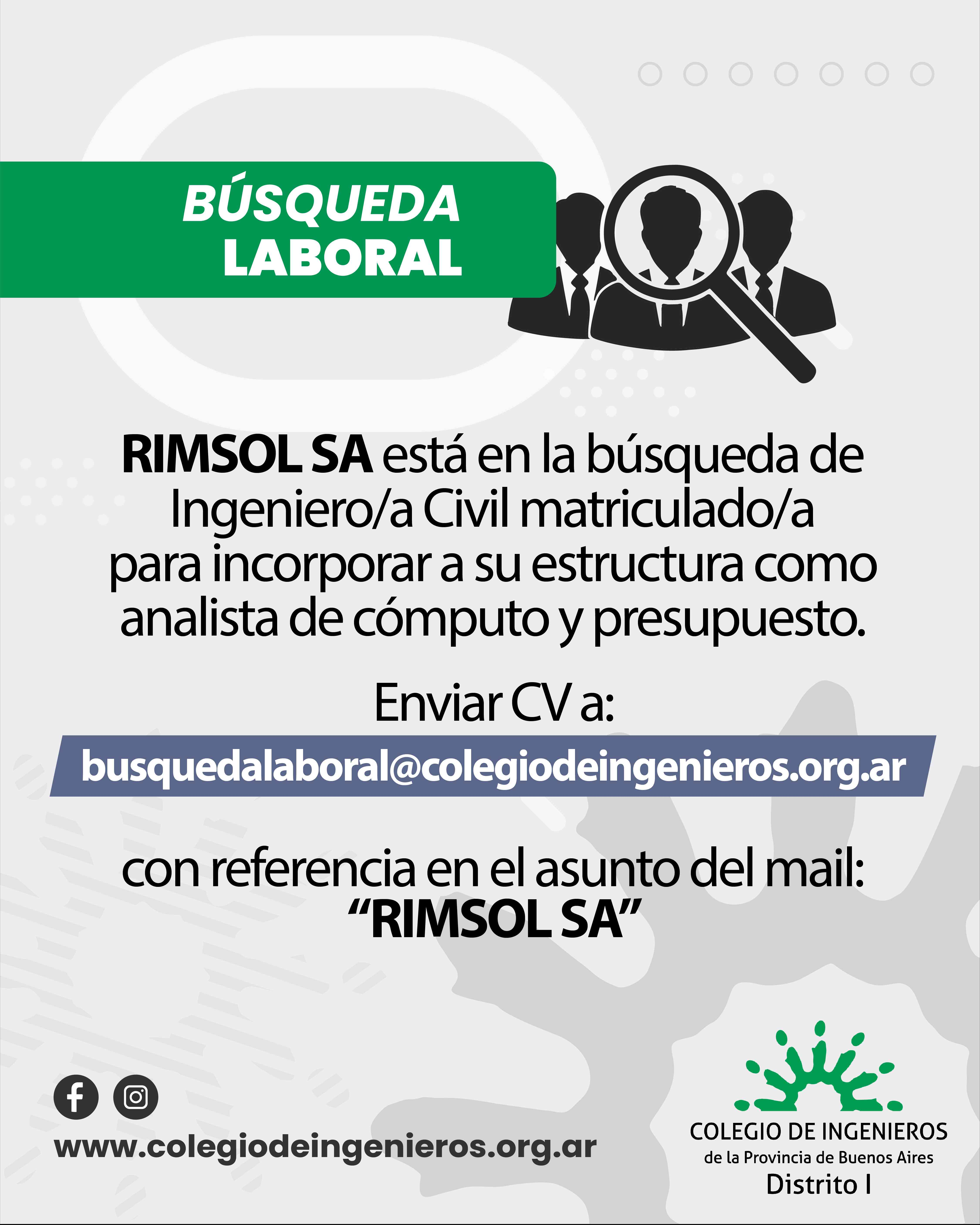 #Empleo #IngenieríaCivil #OportunidadLaboral #Ingenieros #CómputoYPresupuesto #RIMSOL #ColegioDeIngenieros