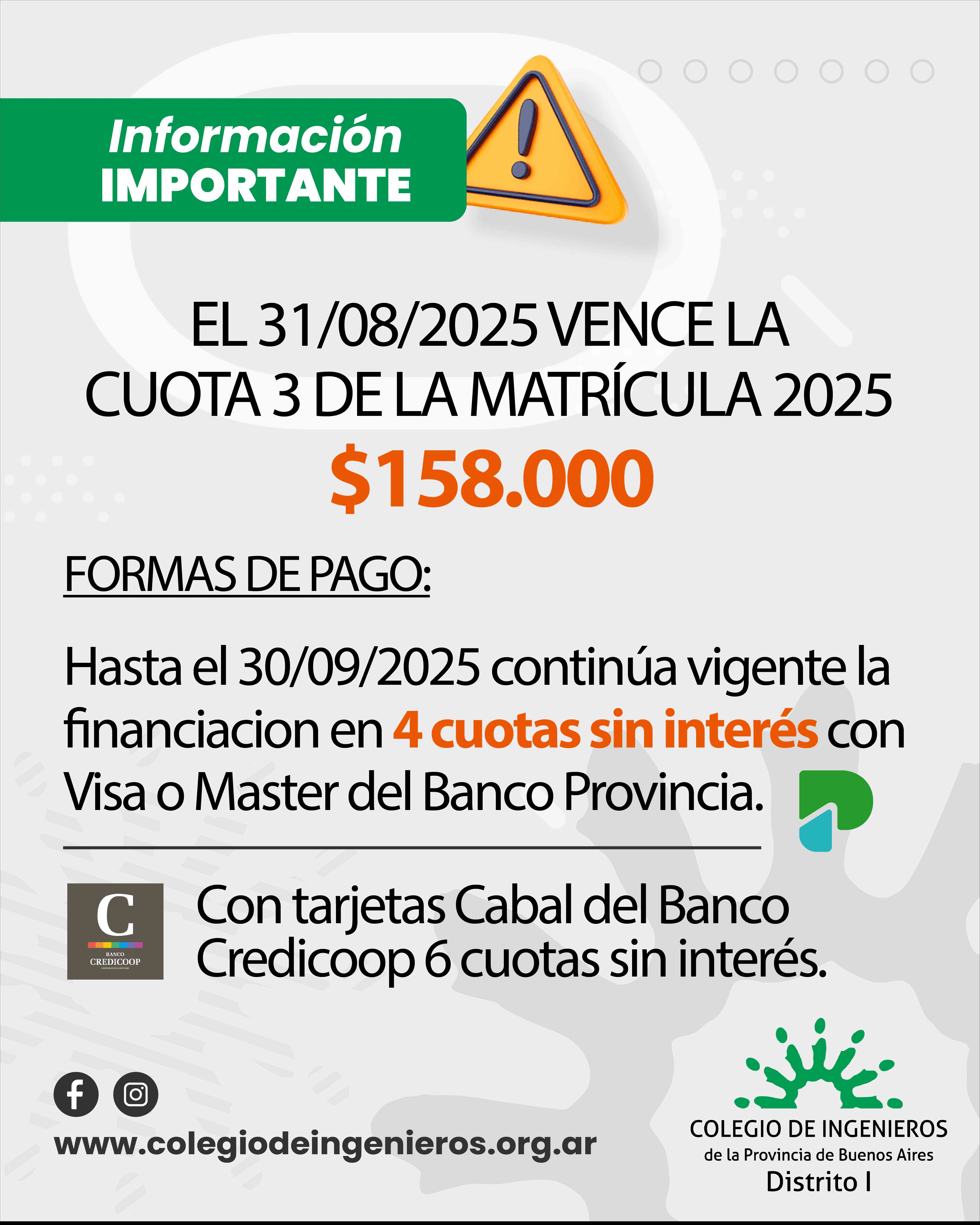 El 31/08/2025 vence la 3° cuota de la matrícula 2025