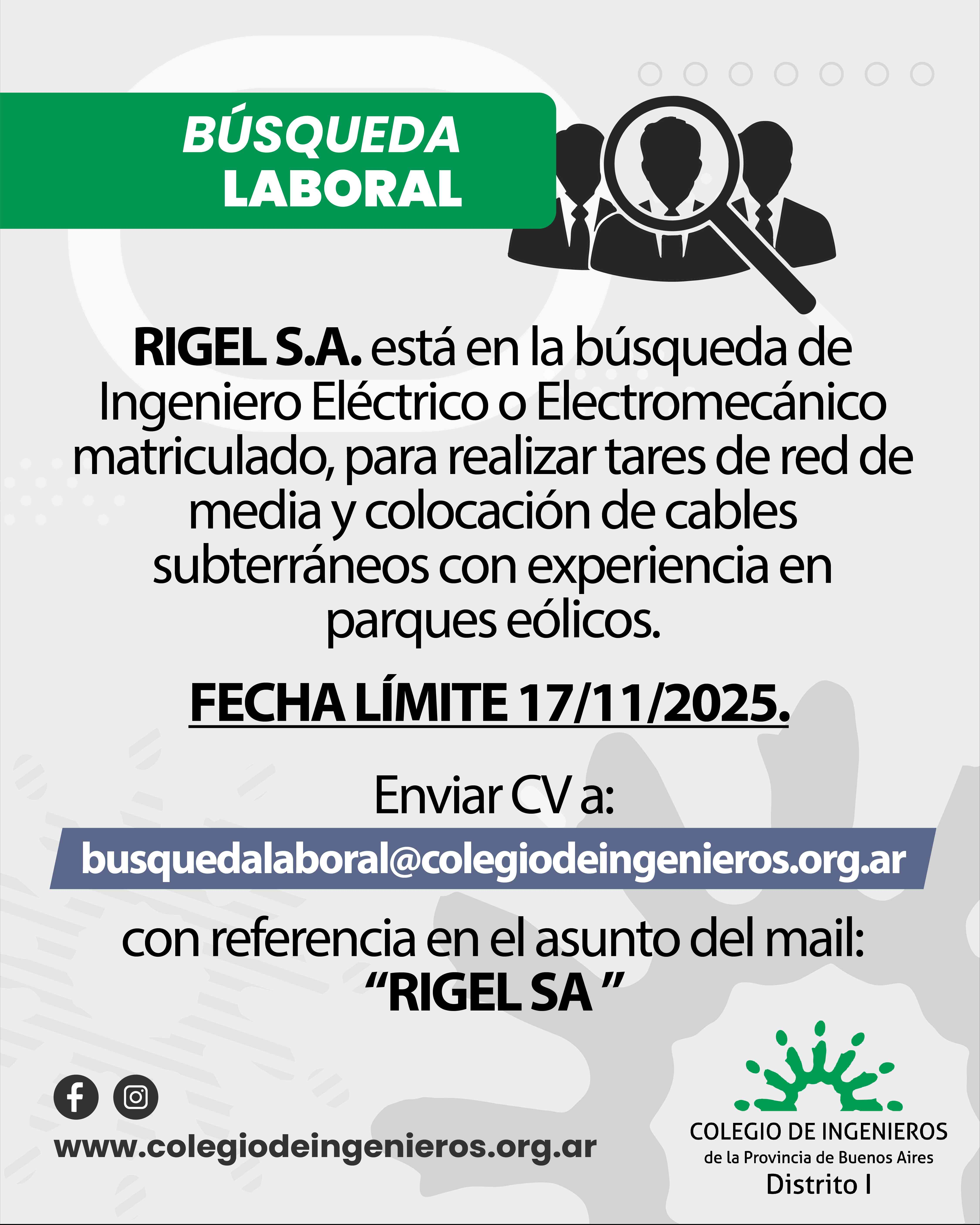 RIGEL S.A está en la búsqueda de Ingeniero Eléctrico o Electromecánico matriculado, para realizar tareas de red de media y colocación de cables subterráneos con experiencia en parques eólicos.