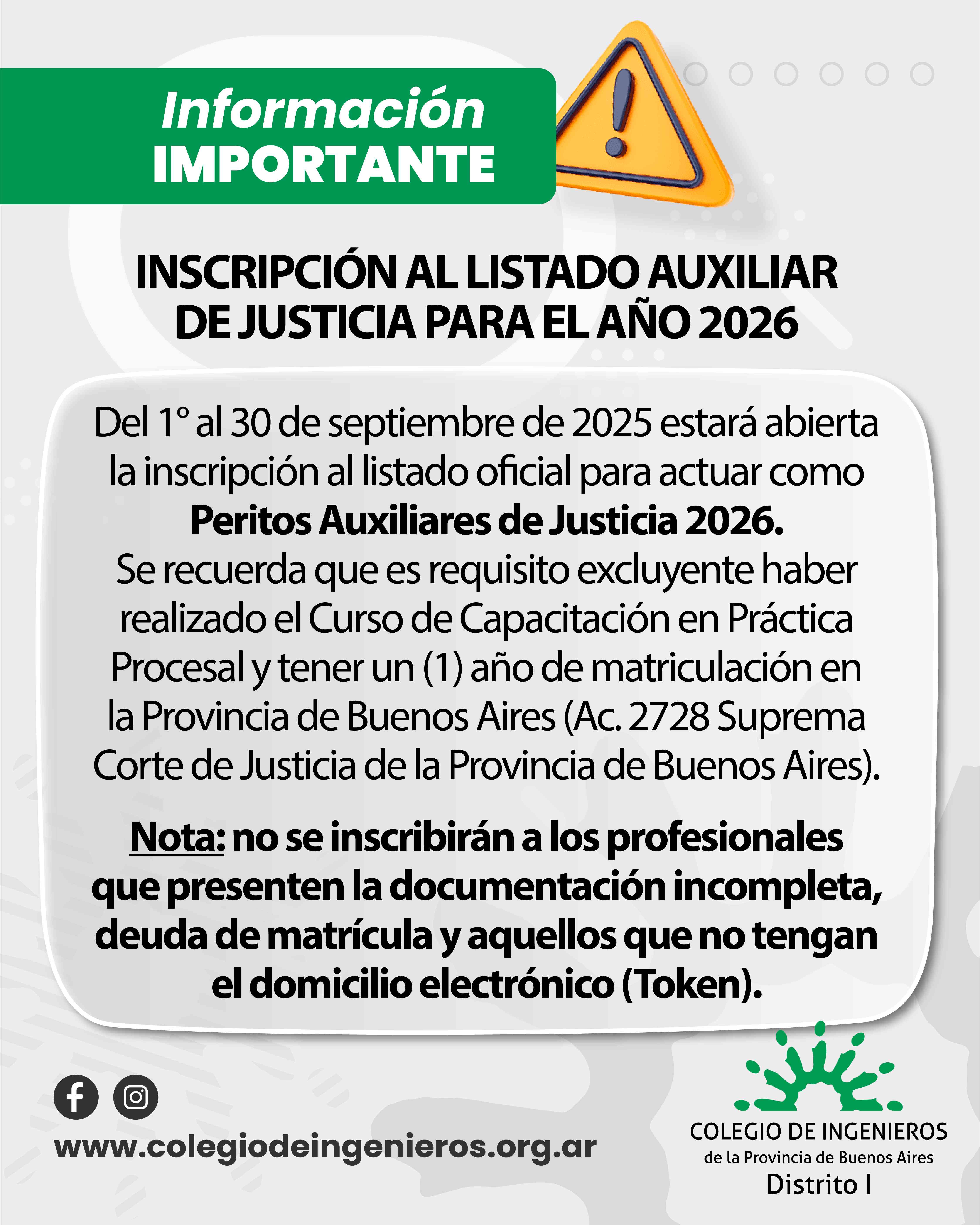 Se recuerda que es requisito excluyente haber realizado el Curso de Capacitación en Práctica Procesal y tener un (1) año de matriculación en la Provincia de Buenos Aires (Ac. 2728 Suprema Corte de Justicia de la Provincia de Buenos Aires).
